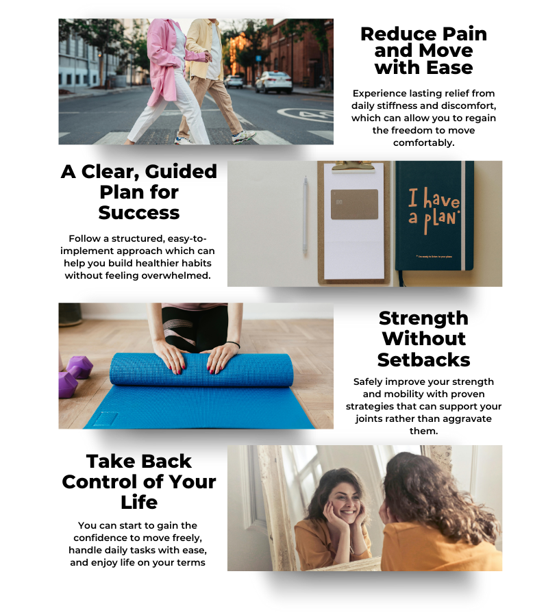 Designed for anyone struggling with knee and hip osteoarthritis, while also being suitable for those with lower back or ankle osteoarthritis who want a guide that can help you reduce your pain, move better, and regain your freedom—without relying solely on medications or surgery.